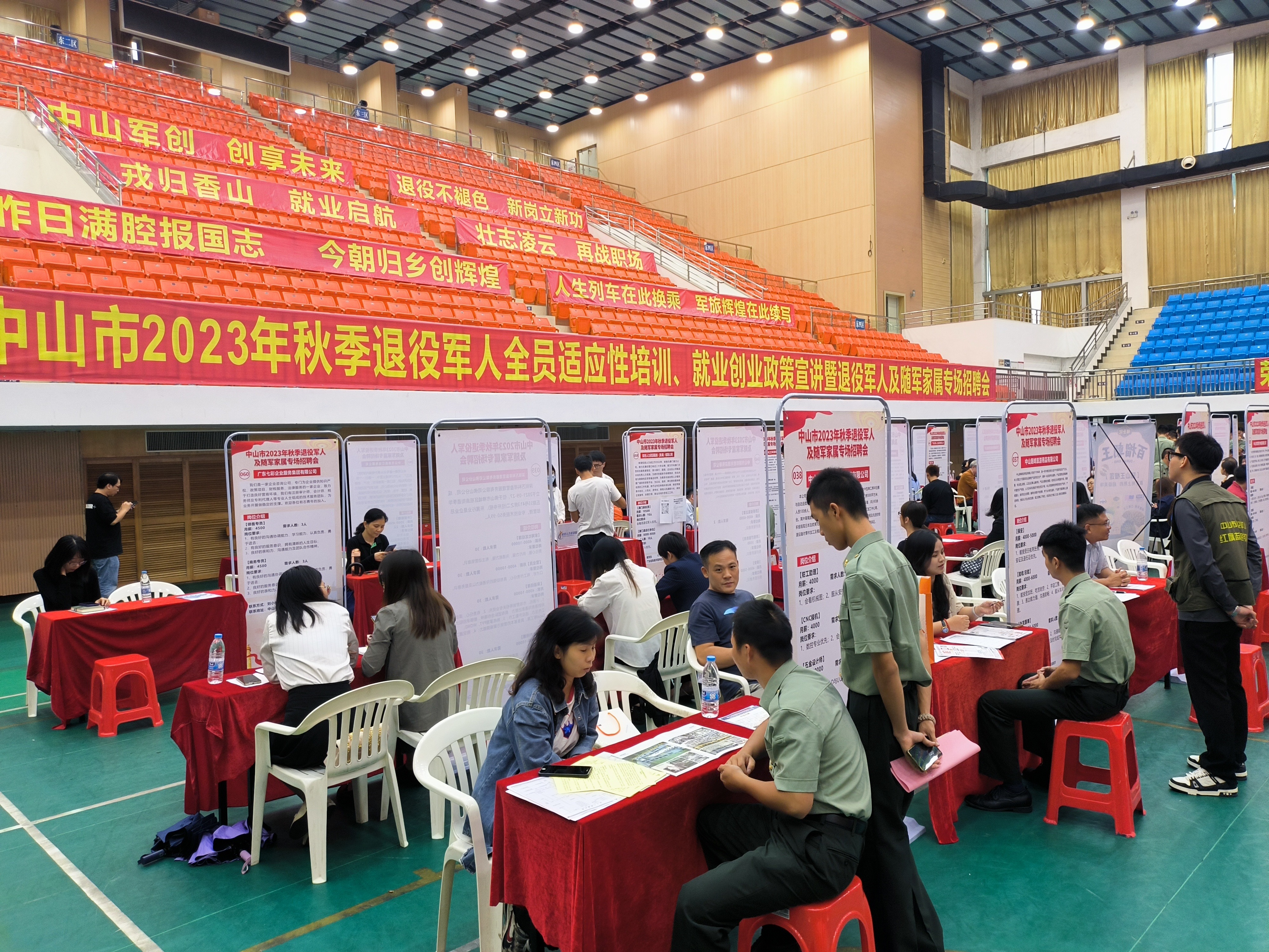 中山市2023年秋季退役軍人及隨軍家屬專場招聘會(huì)現(xiàn)場。(市退役軍人事務(wù)局供圖) 為深入開展“我為群眾辦實(shí)事”實(shí)踐活動(dòng),推動(dòng)主題教育走深走實(shí)、見行見效,10月20日下午,中山市2023年秋季退役軍人及隨軍家屬專場招聘會(huì)在中山火炬職業(yè)技術(shù)學(xué)院體育館成功舉辦。專場招聘會(huì)由中山市退役軍人事務(wù)局主辦,中山火炬職業(yè)技術(shù)學(xué)院、中山市退役軍人服務(wù)中心、各鎮(zhèn)(街)退役軍人服務(wù)中心承辦,中山市才通天下信息科技股份有限公司、中山市退役軍人就業(yè)創(chuàng)業(yè)促進(jìn)會(huì)、中山市愛國擁軍促進(jìn)會(huì)協(xié)辦。
