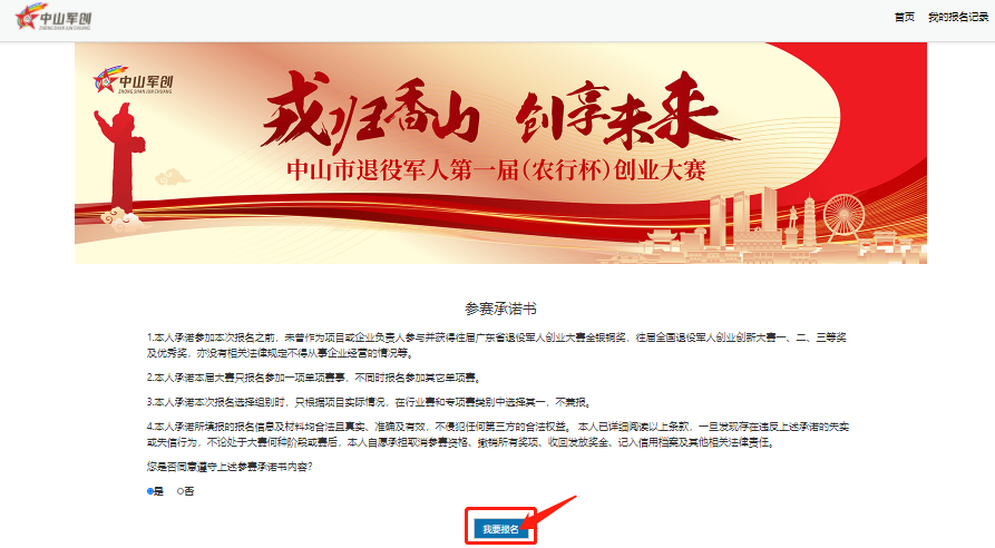 圖6 04 同意參賽承諾書(shū) 點(diǎn)擊首頁(yè),跳轉(zhuǎn)至“參賽承諾書(shū)”界面。仔細(xì)閱讀參賽承諾書(shū),確認(rèn)同意后點(diǎn)擊【我要報(bào)名】按鈕。如圖7-8所示: