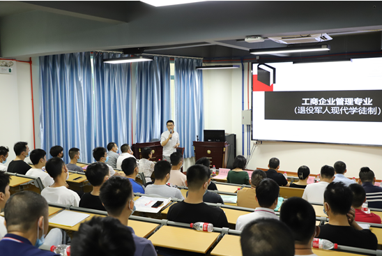 “狹路相逢勇者勝,在座的各位從繁忙的工作崗位上走出來(lái),邁出繼續(xù)學(xué)習(xí)的關(guān)鍵一步,勇氣可嘉。三年后,相信大家一定會(huì)收獲知識(shí)、技能、學(xué)歷,更好地開(kāi)啟新征程?!蓖艘圮娙爽F(xiàn)代學(xué)徒制項(xiàng)目開(kāi)學(xué)典禮上,經(jīng)管學(xué)院院長(zhǎng)肖紅在致辭中對(duì)新生們表示歡迎和祝賀,并表達(dá)了殷切期望,希望大家在求學(xué)期間,修德修身、克勤克儉、心懷理想,腳踏實(shí)地,融入多姿多彩的校園生活,在學(xué)生當(dāng)中彰顯軍人本色和榜樣力量。 市退役軍人事務(wù)局相關(guān)負(fù)責(zé)人對(duì)項(xiàng)目順利開(kāi)班表示祝賀,對(duì)學(xué)院在項(xiàng)目申報(bào)、招生等工作中的辛勤付出表示衷心感謝。他介紹了項(xiàng)目實(shí)施的背景,指出開(kāi)展退役軍人現(xiàn)代學(xué)徒制教育,是退役軍人安置工作的一項(xiàng)重要內(nèi)容,通過(guò)現(xiàn)代學(xué)徒制,讓大家成為全日制大學(xué)生,進(jìn)行正規(guī)系統(tǒng)的高等職業(yè)教育,是黨和政府送給同學(xué)們的一份沉甸甸的“大禮包”。同時(shí),要求新生們盡快適應(yīng)由士兵到大學(xué)生的角色轉(zhuǎn)變,勤學(xué)善思,掌握就業(yè)創(chuàng)業(yè)本領(lǐng),發(fā)揚(yáng)軍隊(duì)能打勝仗的優(yōu)良傳統(tǒng),爭(zhēng)創(chuàng)佳績(jī),為祖國(guó)和地方經(jīng)濟(jì)建設(shè)再立新功。 學(xué)院工商管理專(zhuān)業(yè)主任沈孟康介紹了學(xué)校和學(xué)院概況,就學(xué)生日常管理、教學(xué)內(nèi)容、方式和計(jì)劃等作詳細(xì)說(shuō)明。表示學(xué)校將采取在崗培養(yǎng)與學(xué)校培養(yǎng)相結(jié)合,堅(jiān)持“標(biāo)準(zhǔn)不降、模式多元、學(xué)制靈活”,線(xiàn)上與線(xiàn)下混合教學(xué),實(shí)行工學(xué)交替、靈活多元的教學(xué)模式。經(jīng)管學(xué)院已配備了教授、博士等“精銳”師資團(tuán),“量身定制”人才培養(yǎng)方案,全力保障“八一班”的教育教學(xué)質(zhì)量。