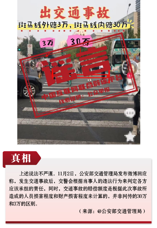 謠言4:行人發(fā)生交通事故,斑馬線外賠償3萬(wàn)、斑馬線內(nèi)賠償30萬(wàn)?