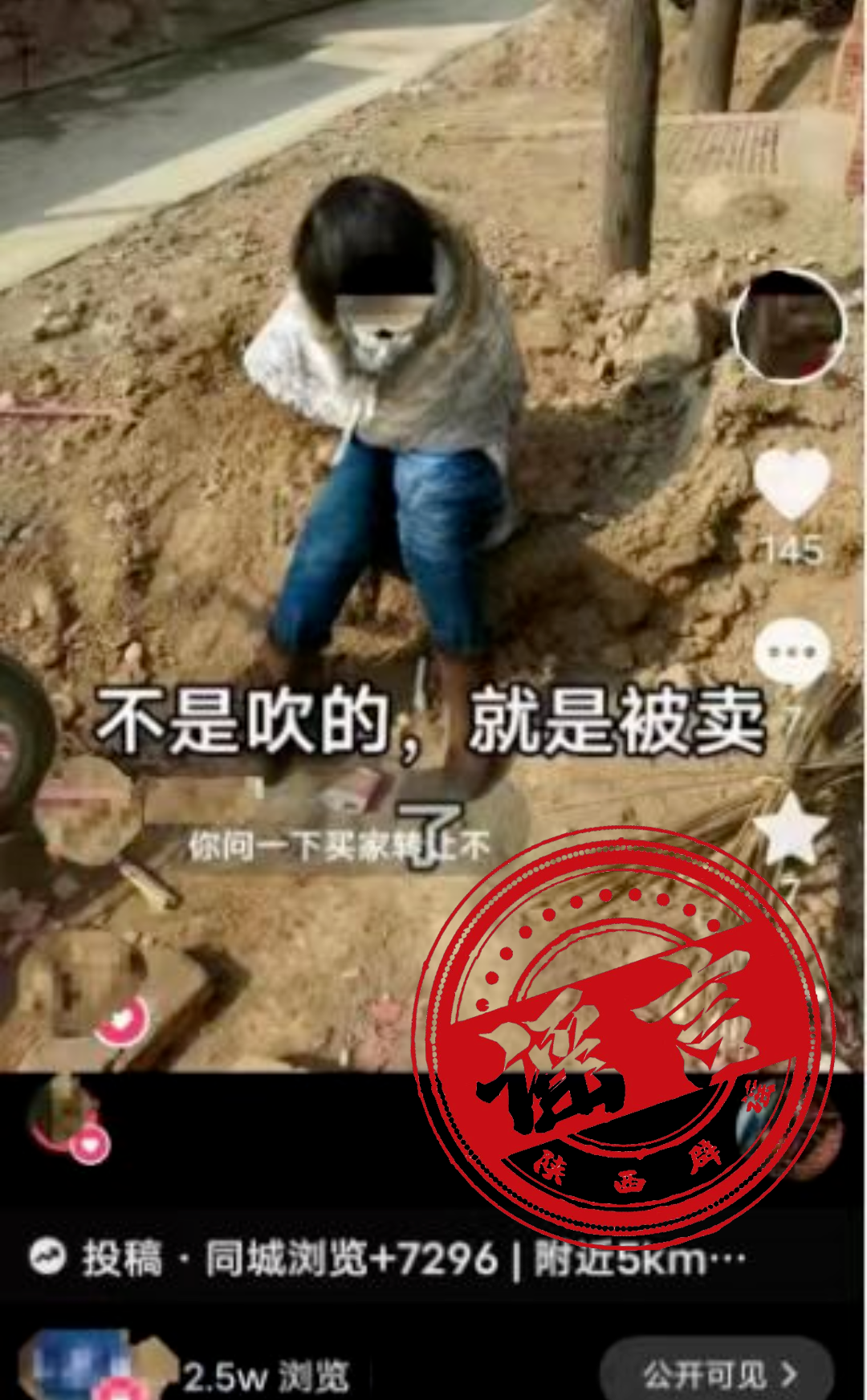 2024年1月10日,網(wǎng)民張某某(女,39歲,蒲城龍陽(yáng)人)為博取關(guān)注、吸引流量,利用了一張自己14年前拍攝坐在土堆前的照片,并配有“不是吹的,就是被賣了”的字眼制作成視頻后,發(fā)布在抖音平臺(tái)上,同時(shí)與網(wǎng)民互動(dòng)交流,先后有超過(guò)2.5萬(wàn)人次瀏覽。