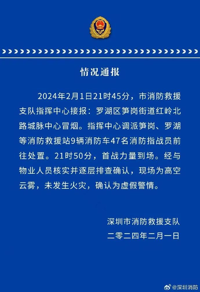 深圳市消防救援支隊(duì)指揮中心調(diào)派筍崗、羅湖等消防救援站9輛消防車47名消防指戰(zhàn)員前往處置。21時50分,首戰(zhàn)力量到場。經(jīng)與物業(yè)人員核實(shí)并逐層排查確認(rèn),現(xiàn)場為高空云霧,未發(fā)生火災(zāi),確認(rèn)為虛假警情。