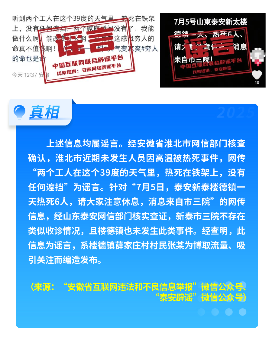 近期,網(wǎng)上接連出現(xiàn)發(fā)布虛假“警情通報(bào)”的惡性造謠傳謠案件,炮制傳播“昆明駕車(chē)撞人案131人死亡”“杭州自來(lái)水接入糞水”及涉釋永信虛假“警情通報(bào)”,模仿“藍(lán)底白字”格式,杜撰聳人聽(tīng)聞細(xì)節(jié),損害政府公信力,嚴(yán)重?cái)_亂社會(huì)秩序?!霸菏款A(yù)測(cè)廣東將發(fā)生8級(jí)以上大地震”公然偽造專家聊天截圖,謊報(bào)地震預(yù)警。還有造謠者借盛夏高溫酷暑與洪澇災(zāi)害,編造“安徽淮北、山東泰安等地多人因高溫死亡” “重慶大暴雨導(dǎo)致15人死亡、4人失蹤”等謠言,蹭炒熱點(diǎn)、煽動(dòng)情緒。