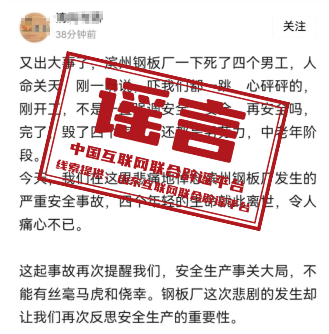 謠 言 山東濱州鋼板廠發(fā)生安全事故死了四個工人?