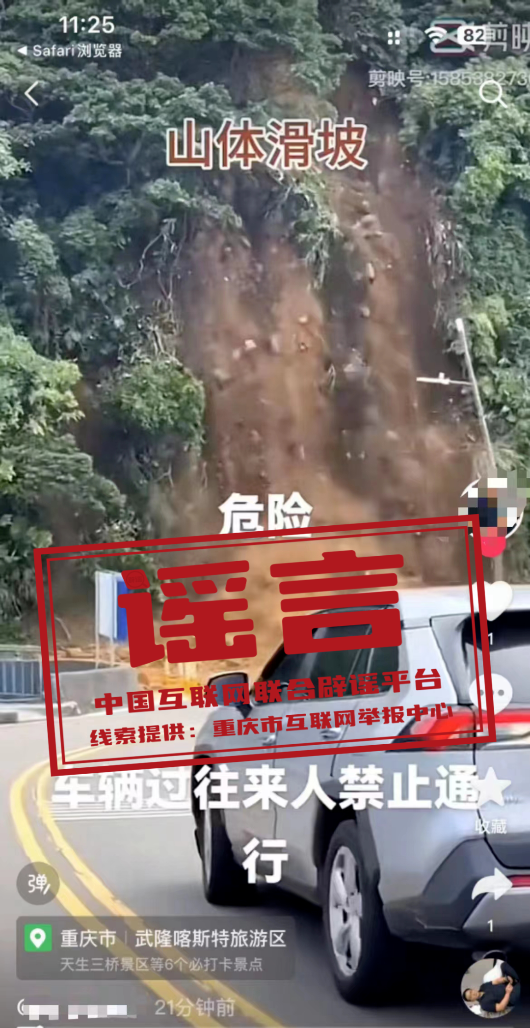 真相:近日,有網(wǎng)民發(fā)布了一則“山體滑坡危險,過往車輛行人禁止通行”的視頻,視頻定位標(biāo)注為“重慶市武隆喀斯特旅游區(qū)”。經(jīng)重慶市武隆區(qū)多部門核實(shí),該區(qū)近期未發(fā)生大面積山體滑坡事件。網(wǎng)傳視頻實(shí)為2024年6月3日臺灣省基隆市中正區(qū)潮境公園入口發(fā)生的大規(guī)模山體滑坡事件,而視頻中所標(biāo)注的定位信息系網(wǎng)民發(fā)布視頻的地點(diǎn),而非事件發(fā)生的地點(diǎn)。(來源:“重慶辟謠”微信公眾號、網(wǎng)信武?。?/span>