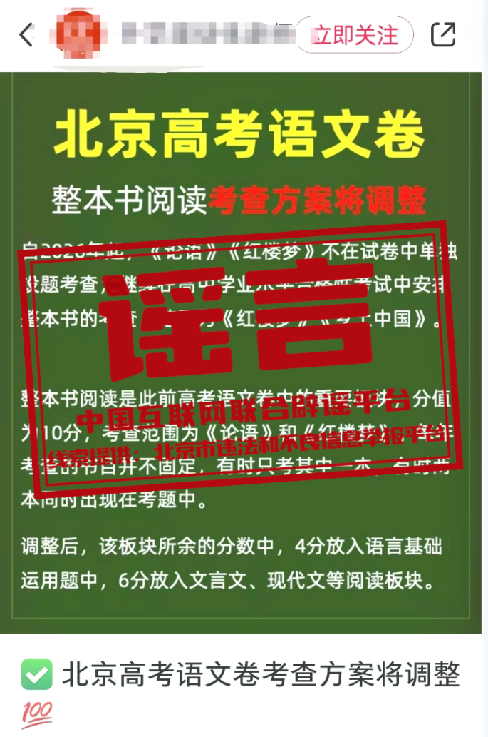真相:近日,關(guān)于“北京高考語文學(xué)科整本書閱讀考查方式調(diào)整”的消息在網(wǎng)絡(luò)上傳播,引發(fā)社會發(fā)注。對此,北京教育考試院發(fā)表聲明稱:該網(wǎng)傳內(nèi)容為不實(shí)信息。北京教育考試院沒有發(fā)布對北京高考語文整本書閱讀考查方式調(diào)整的相關(guān)內(nèi)容,北京高考語文2025、2026年的學(xué)科考試內(nèi)容保持穩(wěn)定,范圍不變。(來源:北京市違法和不良信息舉報平臺、“首都教育”微信公眾號)