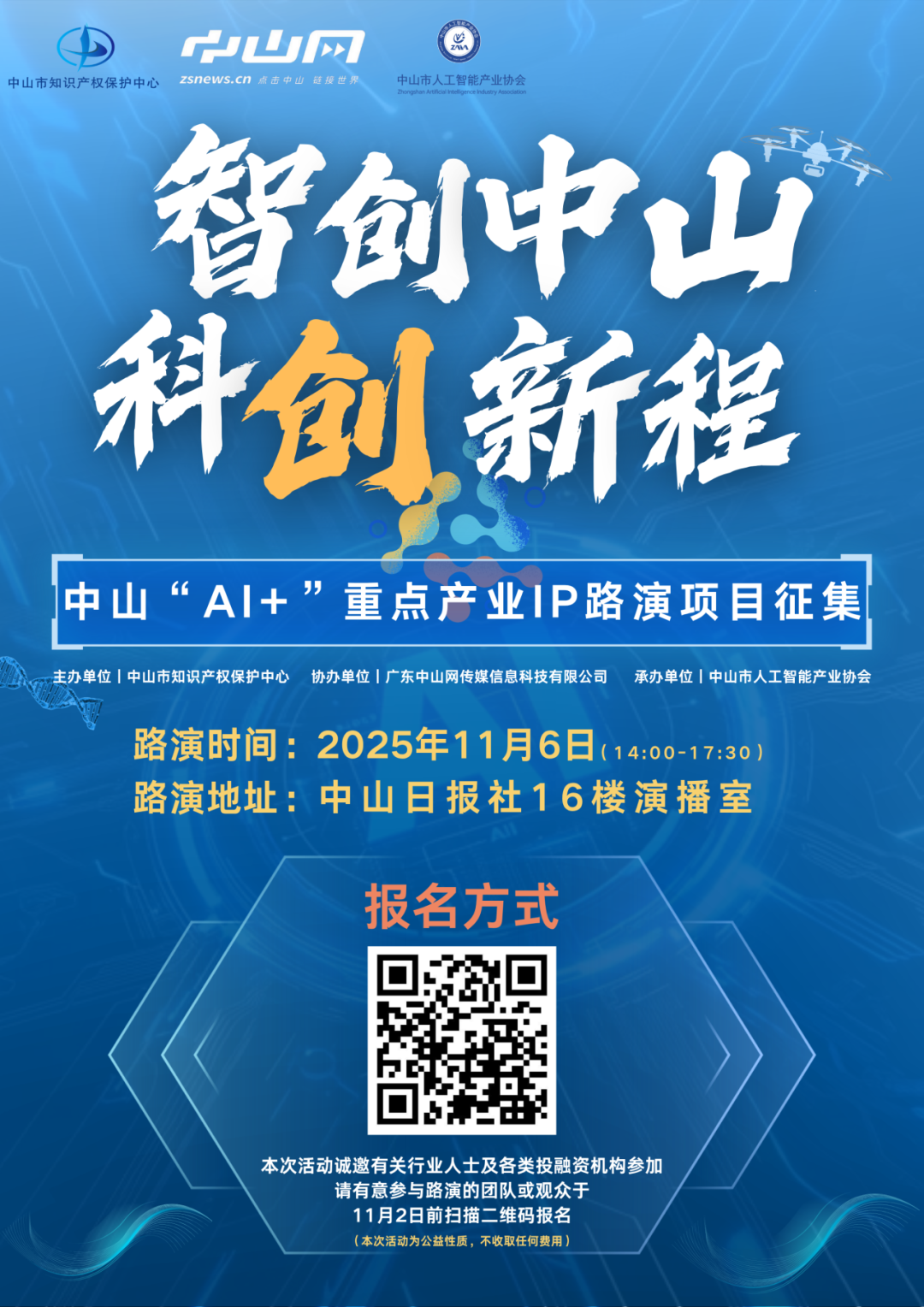 為助力我市加快培育壯大新興產(chǎn)業(yè)、前瞻布局未來(lái)產(chǎn)業(yè),推動(dòng)企業(yè)技術(shù)需求與高校、科研院所專(zhuān)利成果精準(zhǔn)對(duì)接,打通專(zhuān)利轉(zhuǎn)化關(guān)鍵環(huán)節(jié),進(jìn)一步激發(fā)創(chuàng)新活力、拓寬產(chǎn)業(yè)融資渠道,中山市知識(shí)產(chǎn)權(quán)保護(hù)中心將于11月6日(周四)舉辦中山市“AI+”低空經(jīng)濟(jì)、生物醫(yī)藥產(chǎn)業(yè)知識(shí)產(chǎn)權(quán)項(xiàng)目路演活動(dòng)?,F(xiàn)面向全市各類(lèi)創(chuàng)新主體,廣泛征集相關(guān)領(lǐng)域的知識(shí)產(chǎn)權(quán)路演項(xiàng)目。