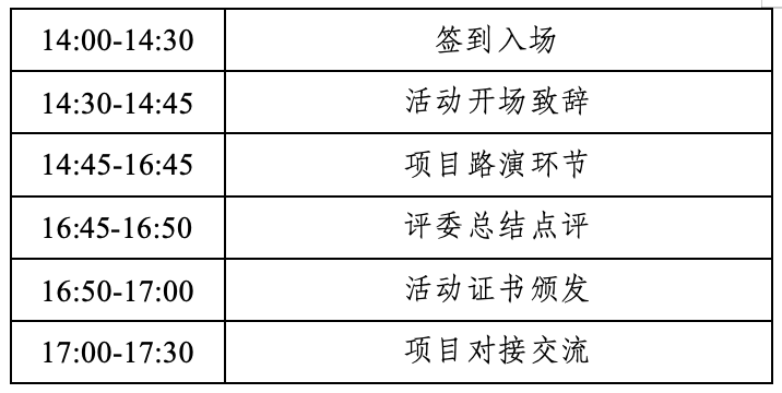 (五)活動(dòng)形式:采用線下路演模式,每個(gè)項(xiàng)目路演時(shí)長(zhǎng)20分鐘以?xún)?nèi)(含15分鐘項(xiàng)目展示+5分鐘評(píng)委提問(wèn)環(huán)節(jié))。